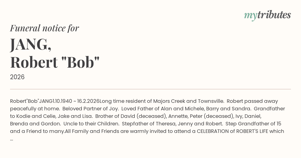 All Family and Friends are warmly invited to attend a CELEBRATION of ROBERT'S LIFE which will commence at 10.00 a.m. WEDNESDAY MORNING 25th FEBRUARY, 2026 at the Lakes Chapel, Morleys Funeral Home, Cnr. Hugh Street and Martinez Avenue, Townsville.