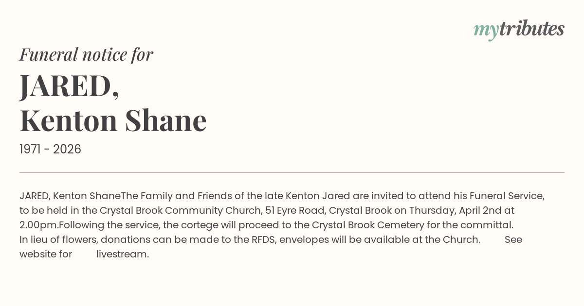 The Family and Friends of the late Kenton Jared are invited to attend his Funeral Service, to be held in the Crystal Brook Community Church, 51 Eyre Road, Crystal Brook on Thursday, April 2nd at 2.00pm.