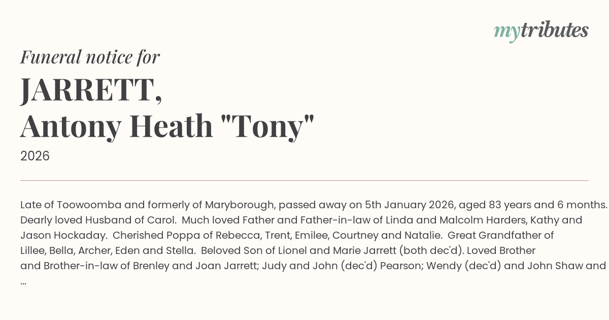 Relatives and friends are respectfully invited to attend a celebration of Tony's life, be held at the T.S. Burstow Chapel, 1020 Ruthven Street (south), Toowoomba, service commencing at 2:30pm, Wednesday, 21st January 2026.