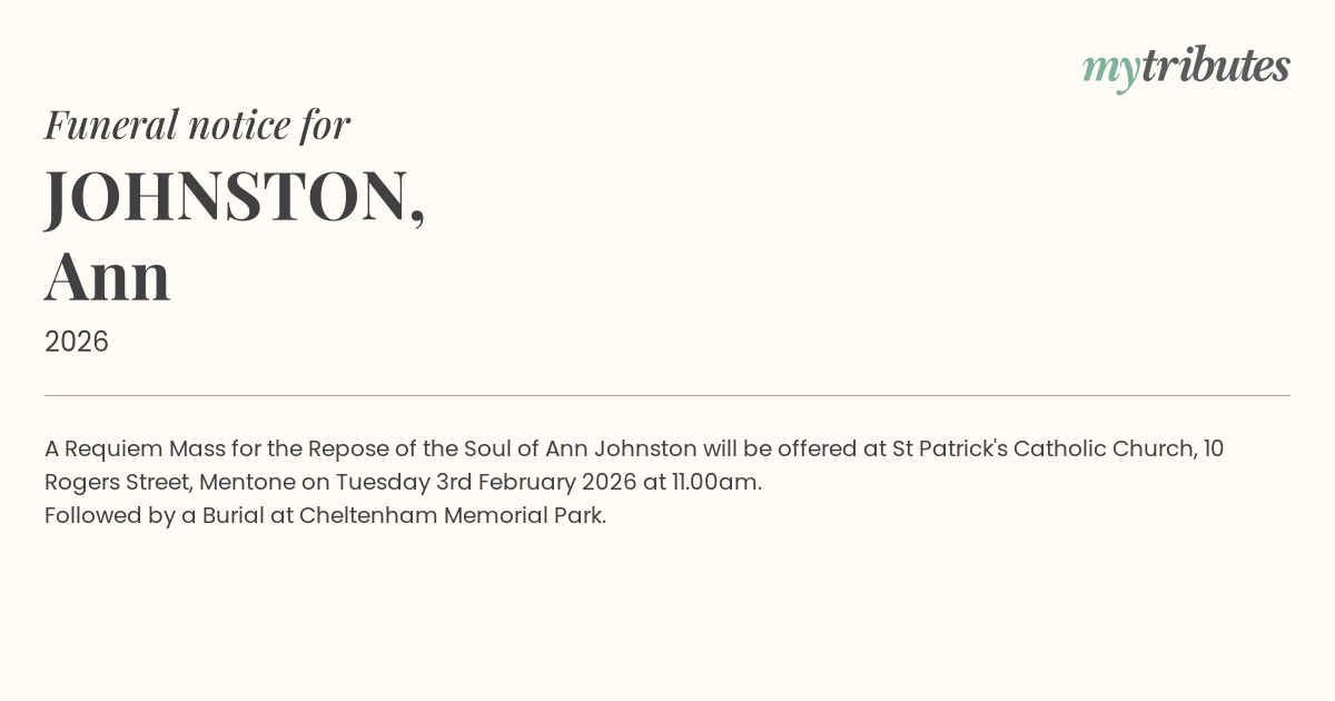 19°CA Requiem Mass for the Repose of the Soul of Ann Johnston will be offered at St Patrick's Catholic Church, 10 Rogers Street, Mentone on Tuesday 3rd February 2026 at 11.00am.