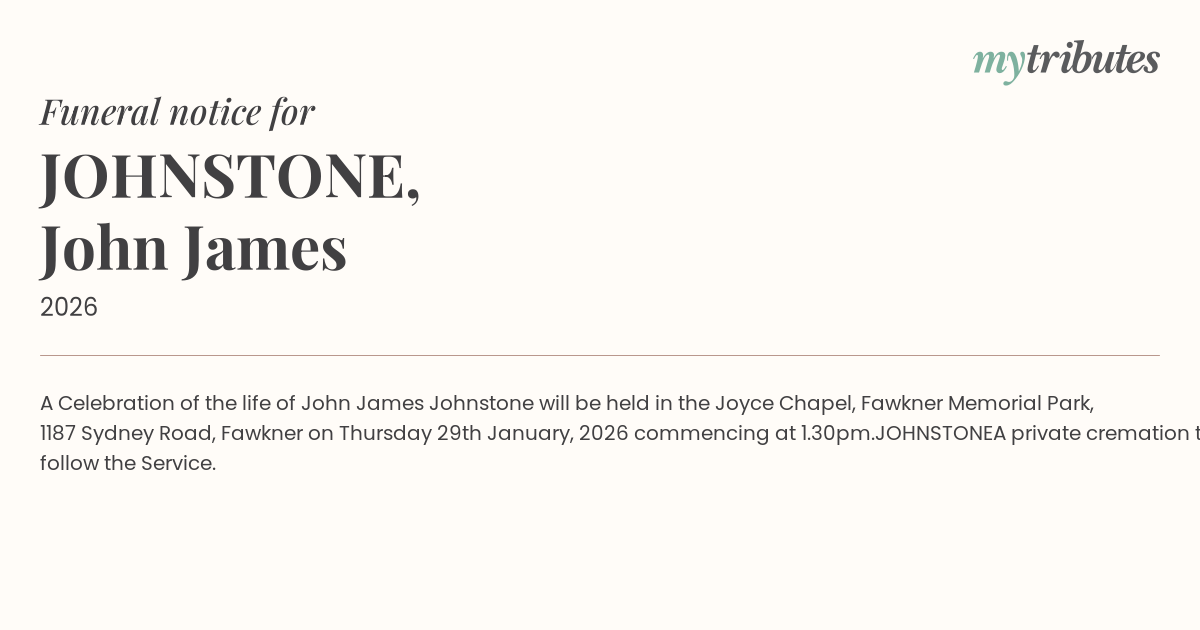 19°CA Celebration of the life of John James Johnstone will be held in the Joyce Chapel, Fawkner Memorial Park, 1187 Sydney Road, Fawkner on Thursday 29th January, 2026 commencing at 1.30pm.