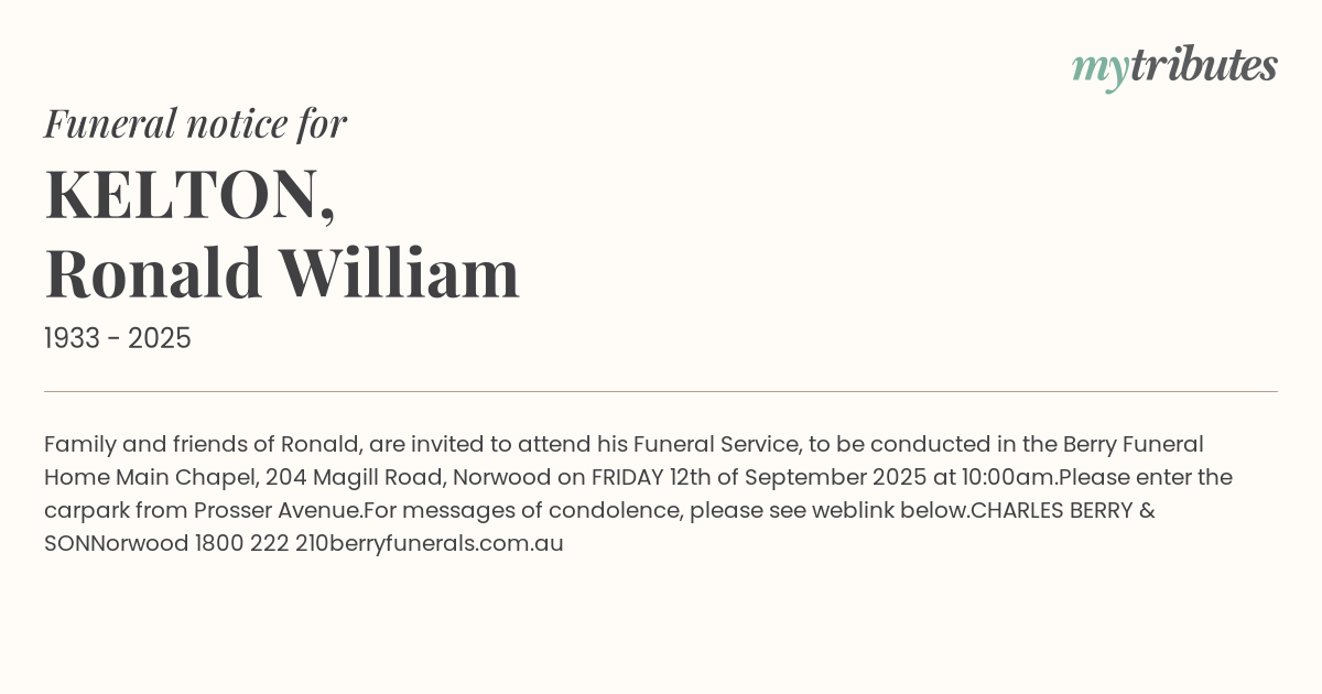 19°CFamily and friends of Ronald, are invited to attend his Funeral Service, to be conducted in the Berry Funeral Home Main Chapel, 204 Magill Road, Norwood on FRIDAY 12th of September 2025 at 10:00am.