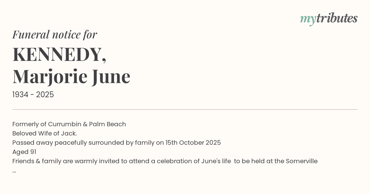 Friends & family are warmly invited to attend a celebration of June's life to be held at the Somerville Funerals Chapel at 129 Nerang Broadbeach Road, Nerang, on the 30th October 2025, at 10am
