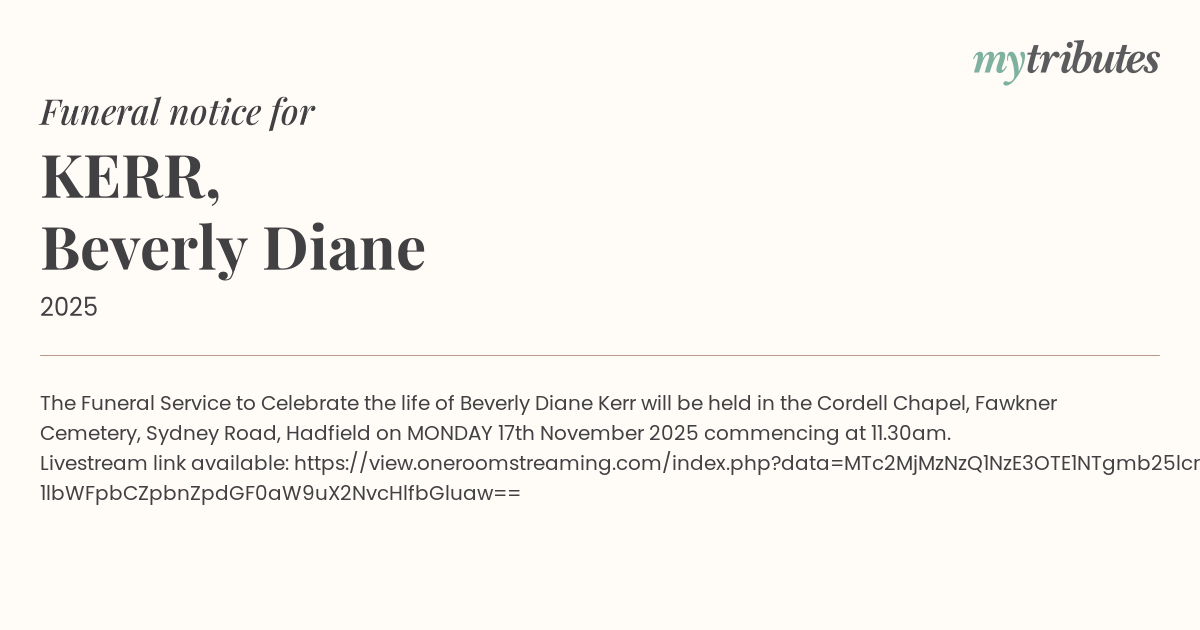19°CThe Funeral Service to Celebrate the life of Beverly Diane Kerr will be held in the Cordell Chapel, Fawkner Cemetery, Sydney Road, Hadfield on MONDAY 17th November 2025 commencing at 11.30am.