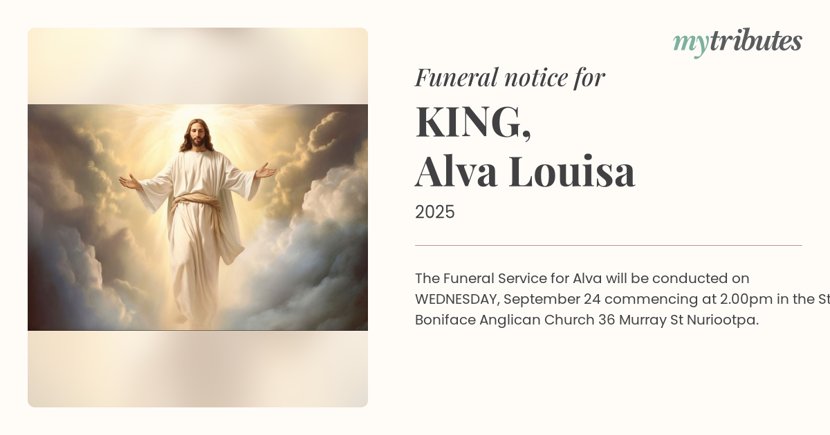 19°CThe Funeral Service for Alva will be conducted on WEDNESDAY, September 24 commencing at 2.00pm in the St. Boniface Anglican Church 36 Murray St Nuriootpa.