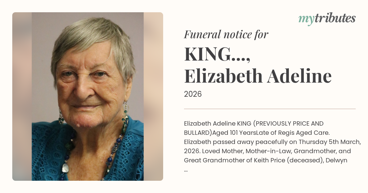 Late of Regis Aged Care. Elizabeth passed away peacefully on Thursday 5th March, 2026. Loved Mother, Mother-in-Law, Grandmother, and Great Grandmother of Keith Price (deceased), Delwyn Johnston, Linda Georgee, Neil Price (deceased), Richard Price and their respective families. Loved Sister and Aunt of Bert Foulsum (deceased), John Foulsum (deceased) and Margaret Coates and their respective families.