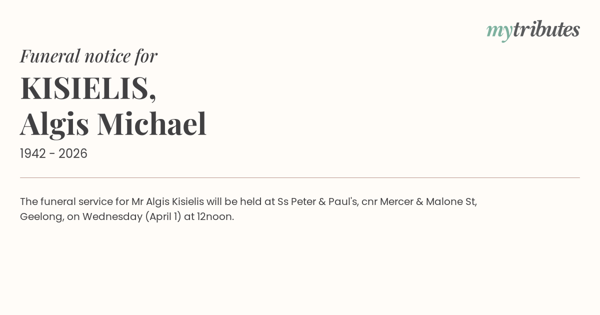 19°CThe funeral service for Mr Algis Kisielis will be held at Ss Peter & Paul's, cnr Mercer & Malone St, Geelong, on Wednesday (April 1) at 12noon.