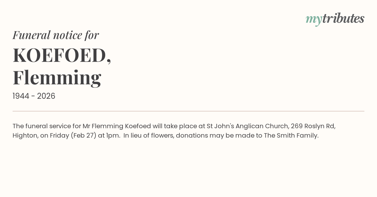 19°CThe funeral service for Mr Flemming Koefoed will take place at St John's Anglican Church, 269 Roslyn Rd, Highton, on Friday (Feb 27) at 1pm. In lieu of flowers, donations may be made to The Smith Family.