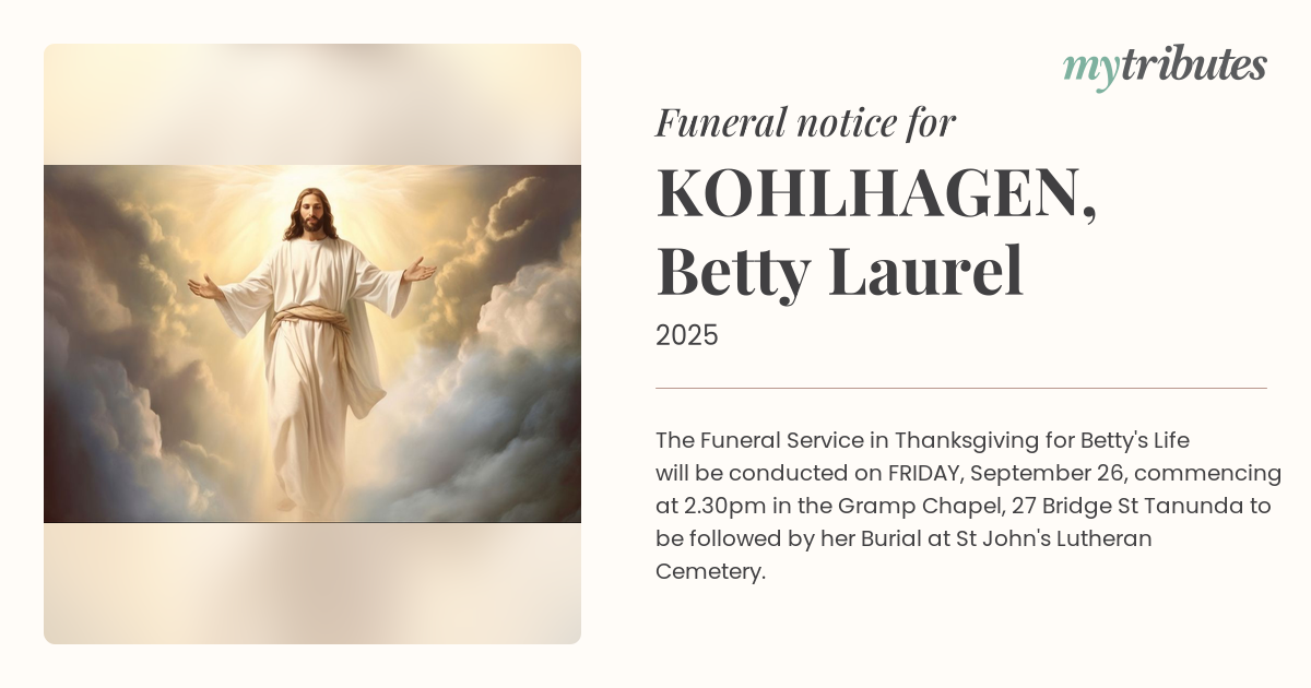 19°CThe Funeral Service in Thanksgiving for Betty's Life will be conducted on FRIDAY, September 26, commencing at 2.30pm in the Gramp Chapel, 27 Bridge St Tanunda to be followed by her Burial at St John's Lutheran Cemetery.
