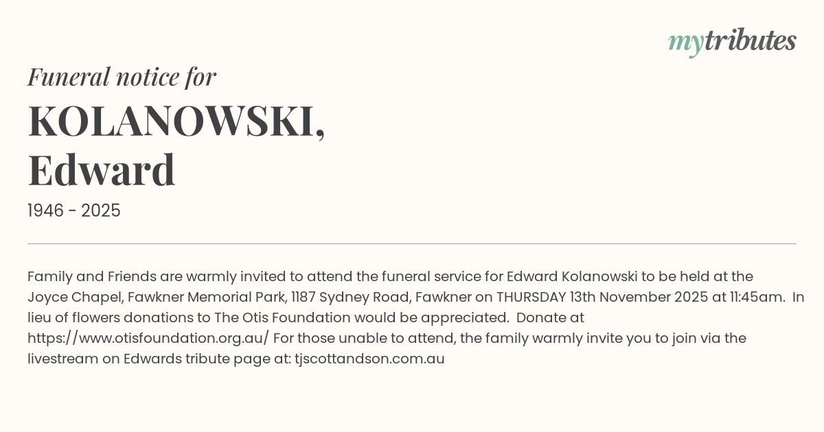 For those unable to attend, the family warmly invite you to join via the livestream on Edward’s tribute page at: tjscottandson.com.au