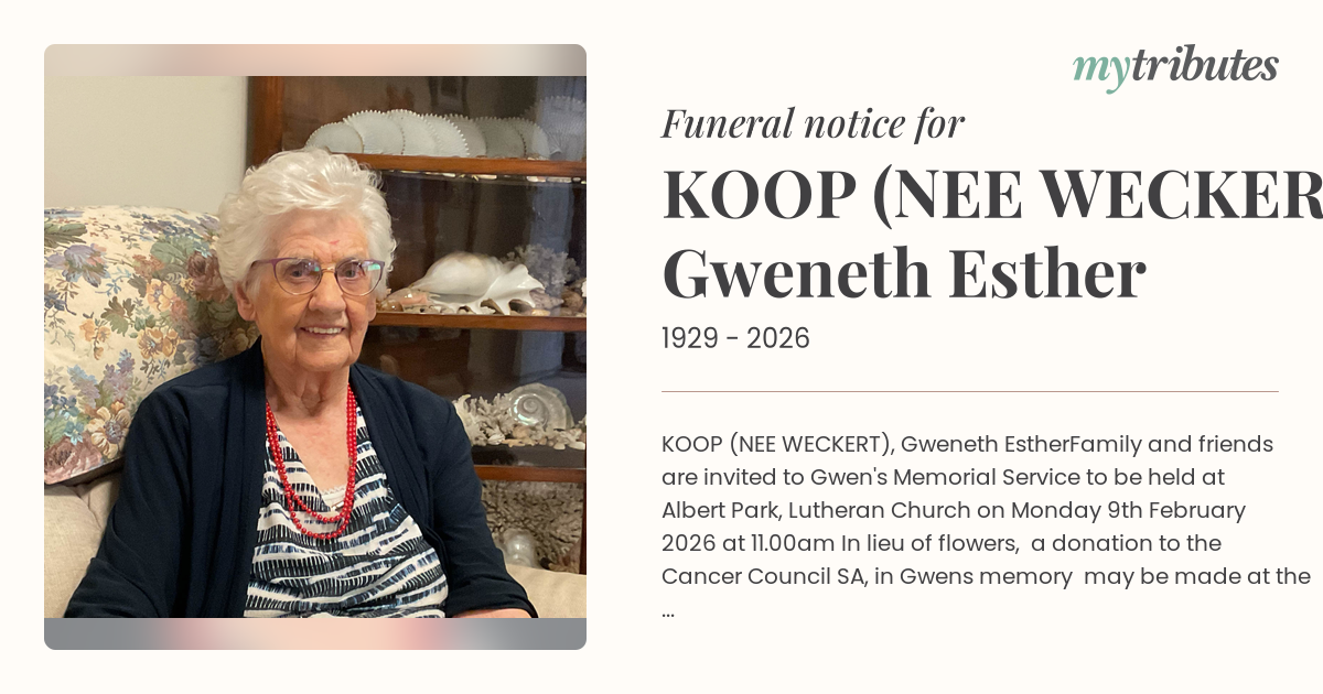 Family and friends are invited to Gwen's Memorial Service to be held at Albert Park, Lutheran Church on Monday 9th February 2026 at 11.00am In lieu of flowers,
