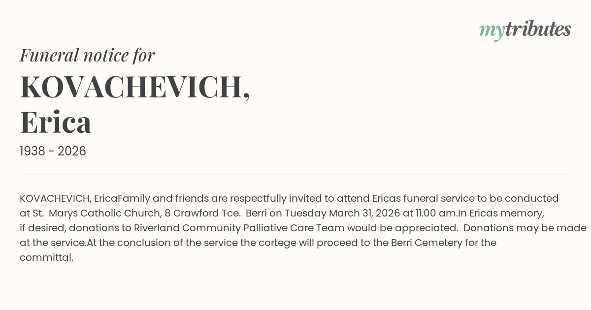 Family and friends are respectfully invited to attend Erica’s funeral service to be conducted at St. Mary’s Catholic Church, 8 Crawford Tce. Berri on Tuesday March 31, 2026 at 11.00 am.