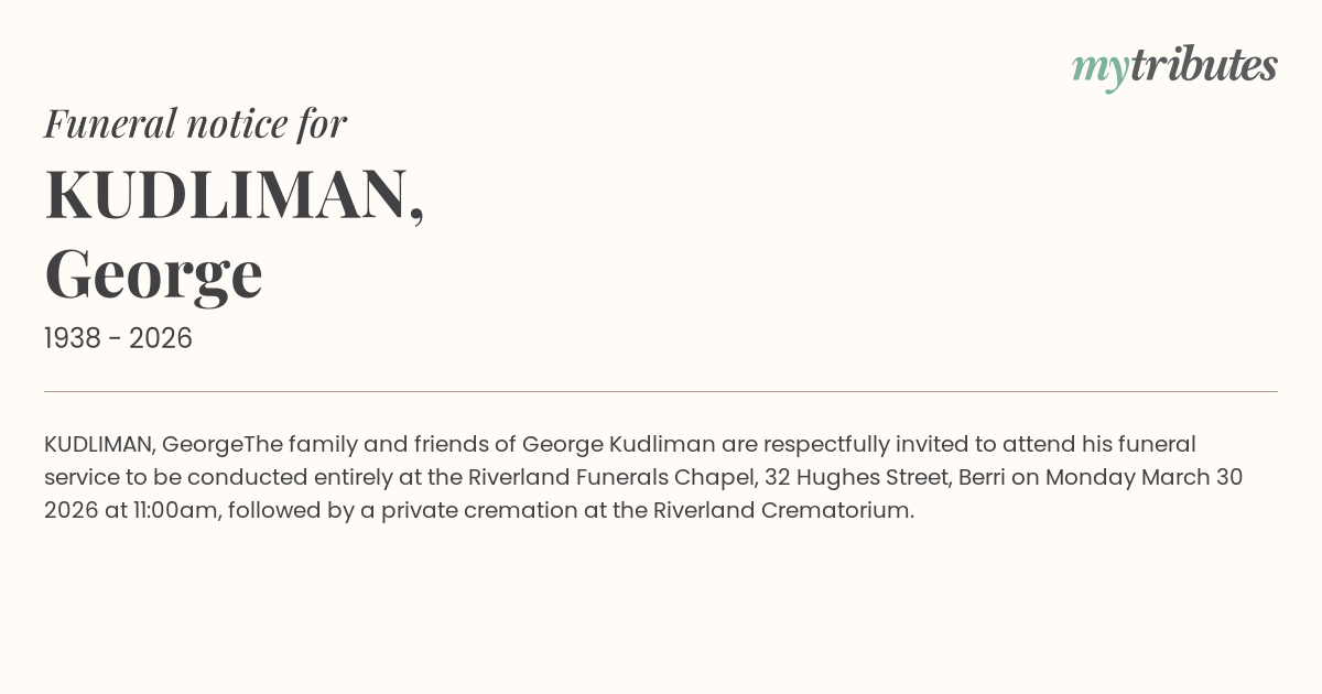 The family and friends of George Kudliman are respectfully invited to attend his funeral service to be conducted entirely at the Riverland Funerals Chapel, 32 Hughes Street, Berri on Monday March 30 2026 at 11:00am, followed by a private cremation at the Riverland Crematorium.