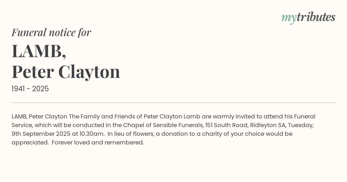 The Family and Friends of Peter Clayton Lamb are warmly invited to attend his Funeral Service, which will be conducted in the Chapel of Sensible Funerals, 151 South Road, Ridleyton SA,