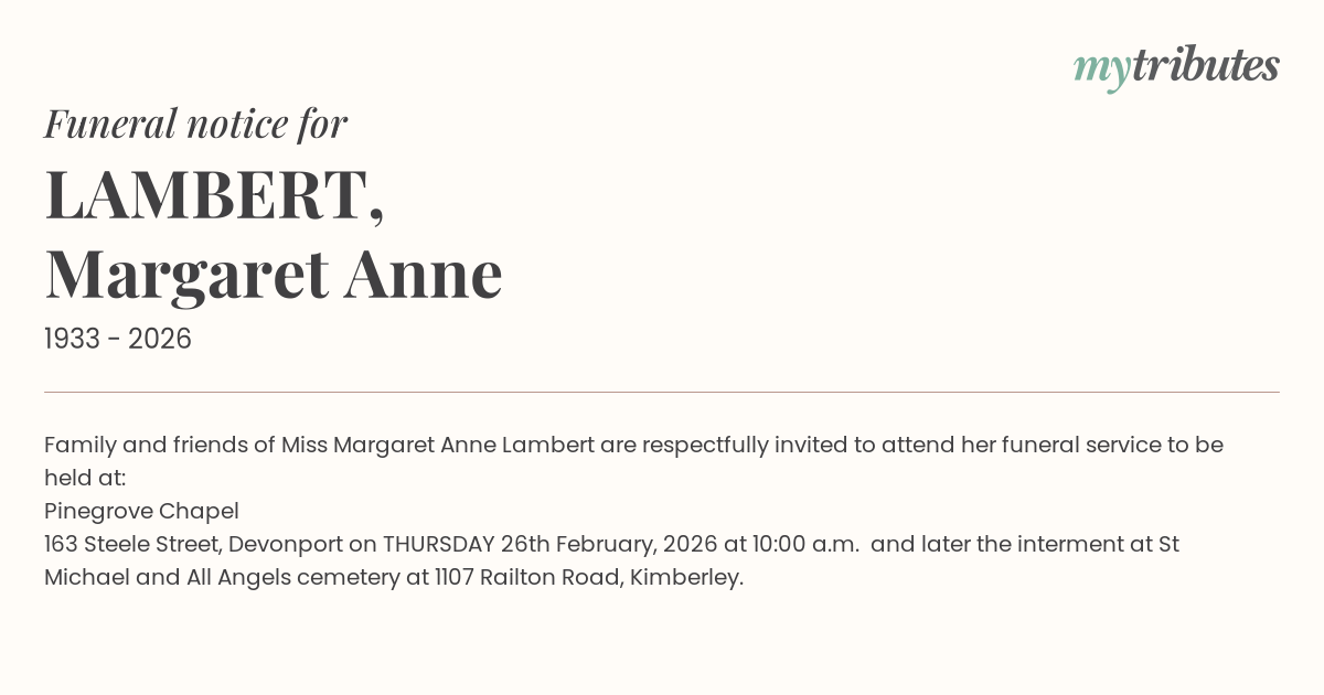 19°CFamily and friends of Miss Margaret Anne Lambert are respectfully invited to attend her funeral service to be held at: Pinegrove Chapel 163 Steele Street, Devonport on THURSDAY 26th February, 2026 at 10:00 a.m. and later the interment at St Michael and All Angels cemetery at 1107 Railton Road, Kimberley.