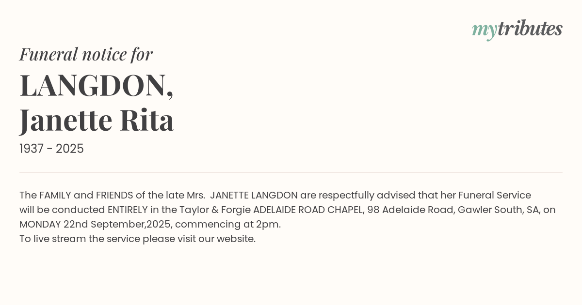 19°CThe FAMILY and FRIENDS of the late Mrs. JANETTE LANGDON are respectfully advised that her Funeral Service will be conducted ENTIRELY in the Taylor & Forgie ADELAIDE ROAD CHAPEL, 98 Adelaide Road, Gawler South, SA, on MONDAY 22nd September,2025, commencing at 2pm.