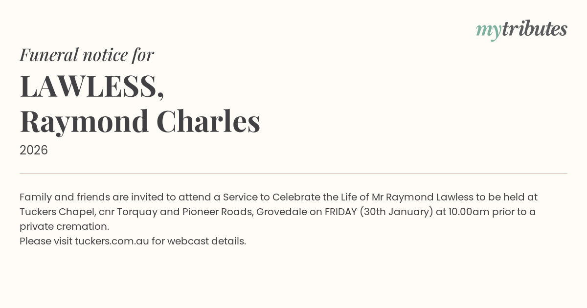 19°CFamily and friends are invited to attend a Service to Celebrate the Life of Mr Raymond Lawless to be held at Tuckers Chapel, cnr Torquay and Pioneer Roads, Grovedale on FRIDAY (30th January) at 10.00am prior to a private cremation.