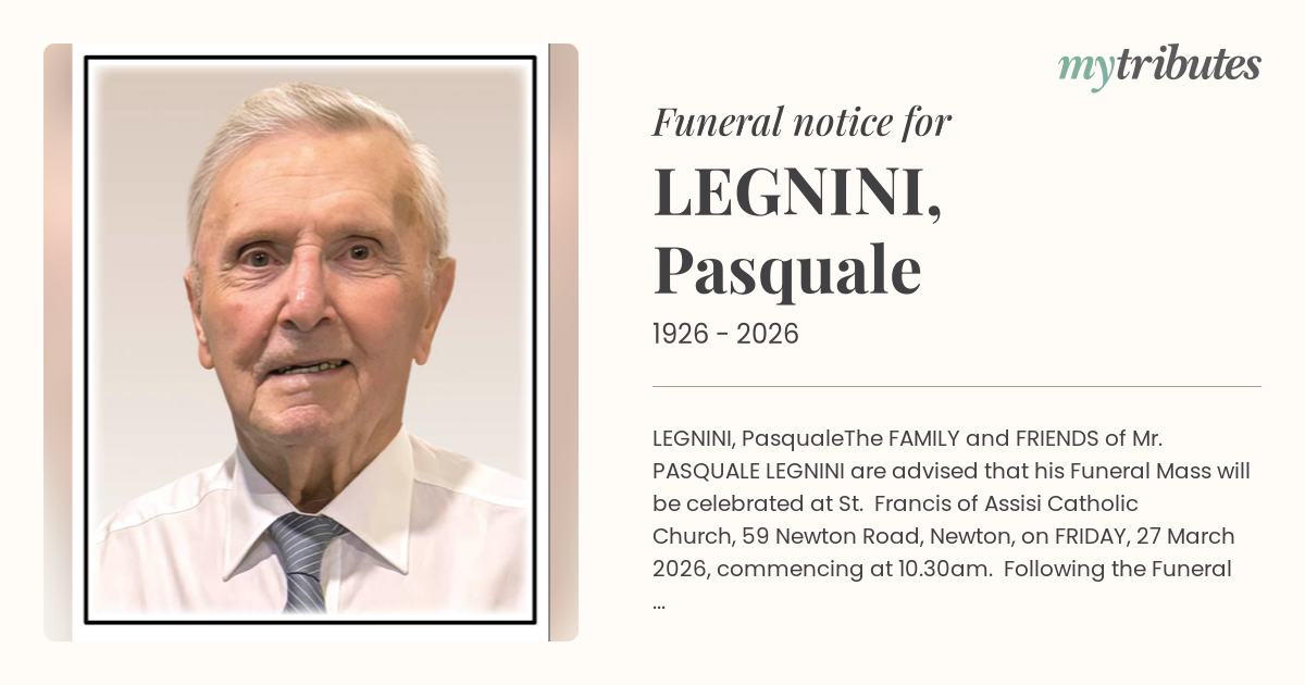 The FAMILY and FRIENDS of Mr. PASQUALE LEGNINI are advised that his Funeral Mass will be celebrated at St. Francis of Assisi Catholic Church, 59 Newton Road, Newton, on FRIDAY, 27 March 2026, commencing at 10.30am.