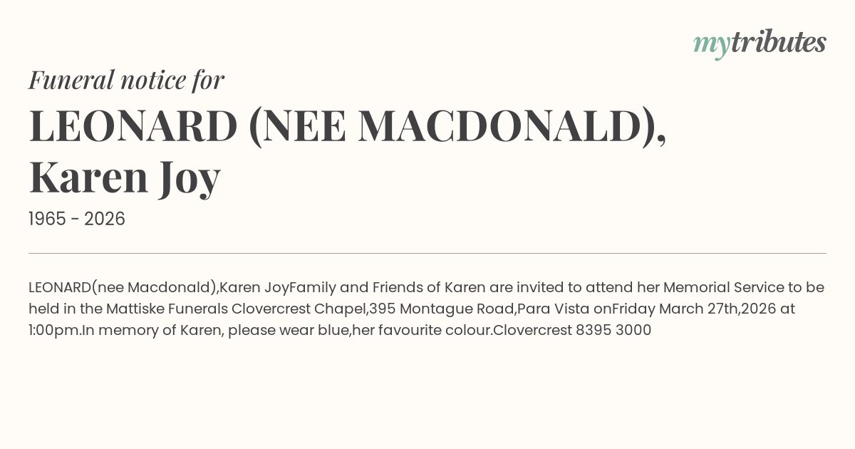 Family and Friends of Karen are invited to attend her Memorial Service to be held in the Mattiske Funerals Clovercrest Chapel,