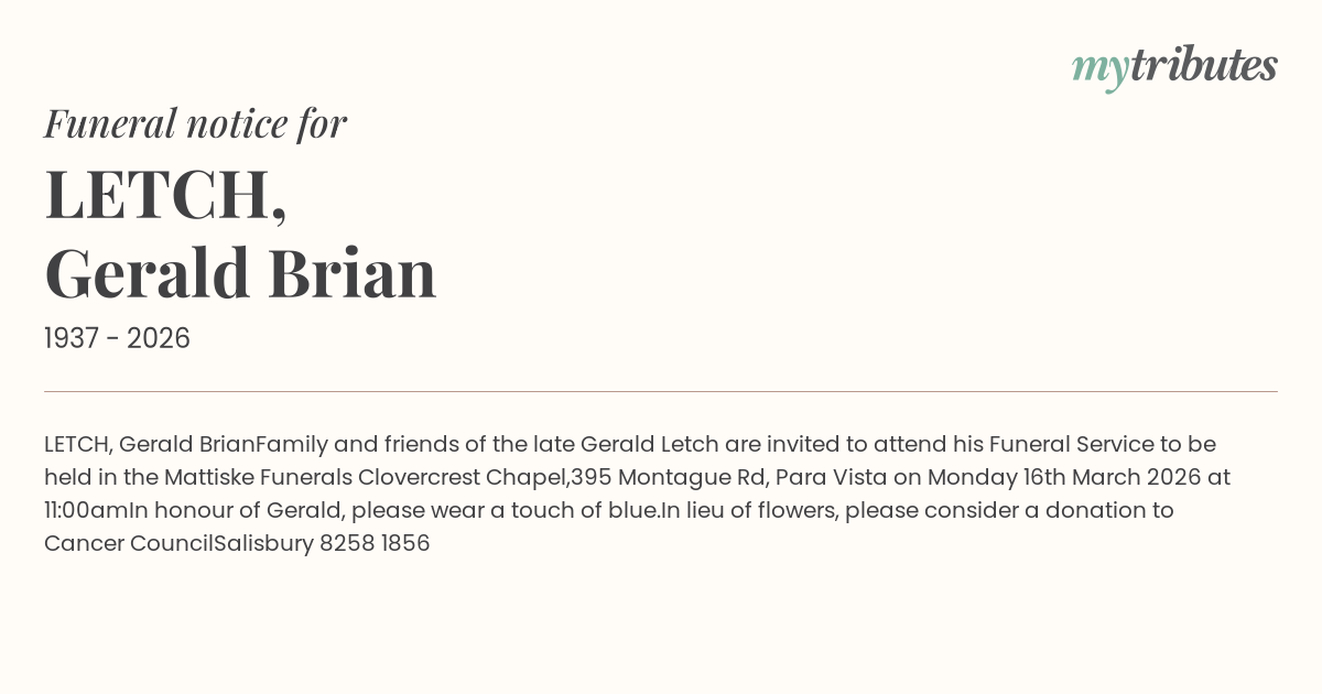 Family and friends of the late Gerald Letch are invited to attend his Funeral Service to be held in the Mattiske Funerals Clovercrest Chapel,