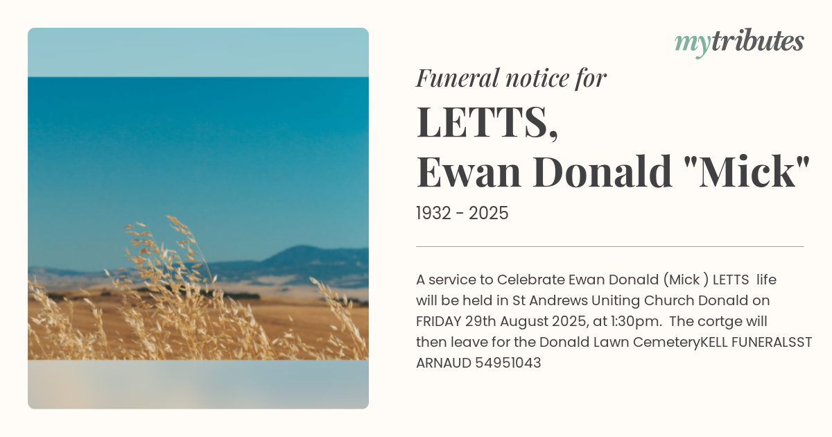 19°CA service to Celebrate Ewan Donald (Mick ) LETTS life will be held in St Andrew’s Uniting Church Donald on FRIDAY 29th August 2025, at 1:30pm. The cortège will then leave for the Donald Lawn Cemetery