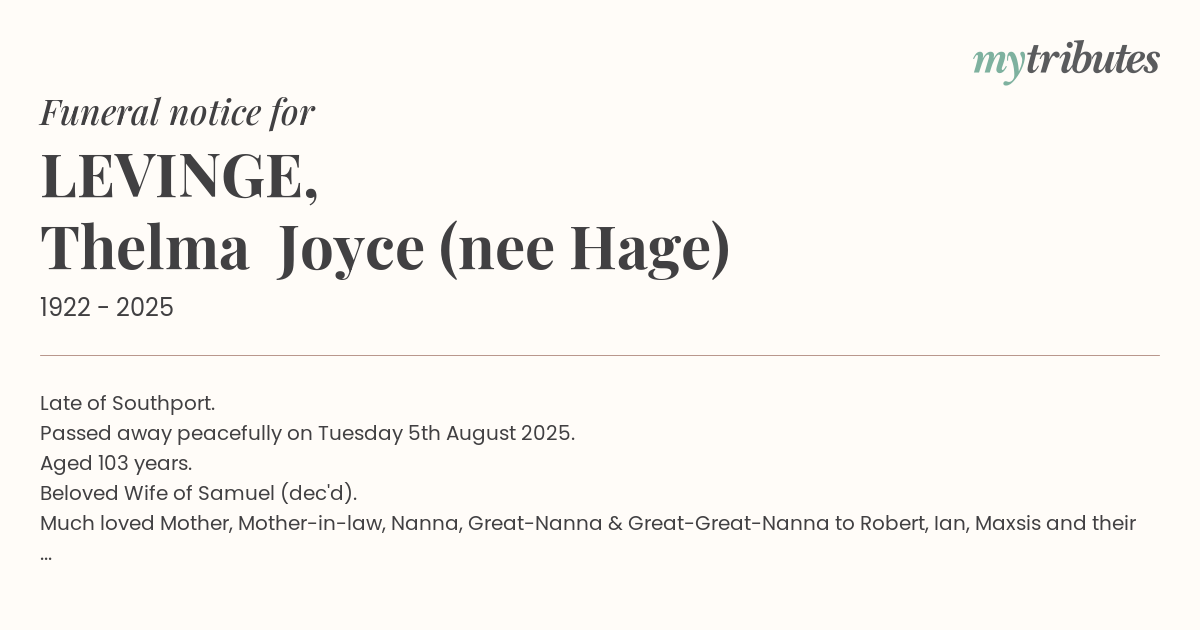 Relatives and Friends of Thelma are respectfully invited to attend Her Funeral Service to be held at The Garden Chapel, Allambe Memorial Gardens, 129 Nerang Broadbeach Rd, Nerang on Wednesday 20th August 2025 at 11:30am.