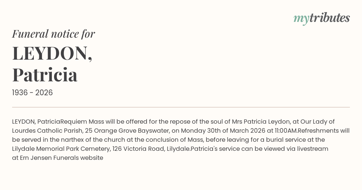 Requiem Mass will be offered for the repose of the soul of Mrs Patricia Leydon, at Our Lady of Lourdes Catholic Parish, 25 Orange Grove Bayswater, on Monday 30th of March 2026 at 11:00AM.
