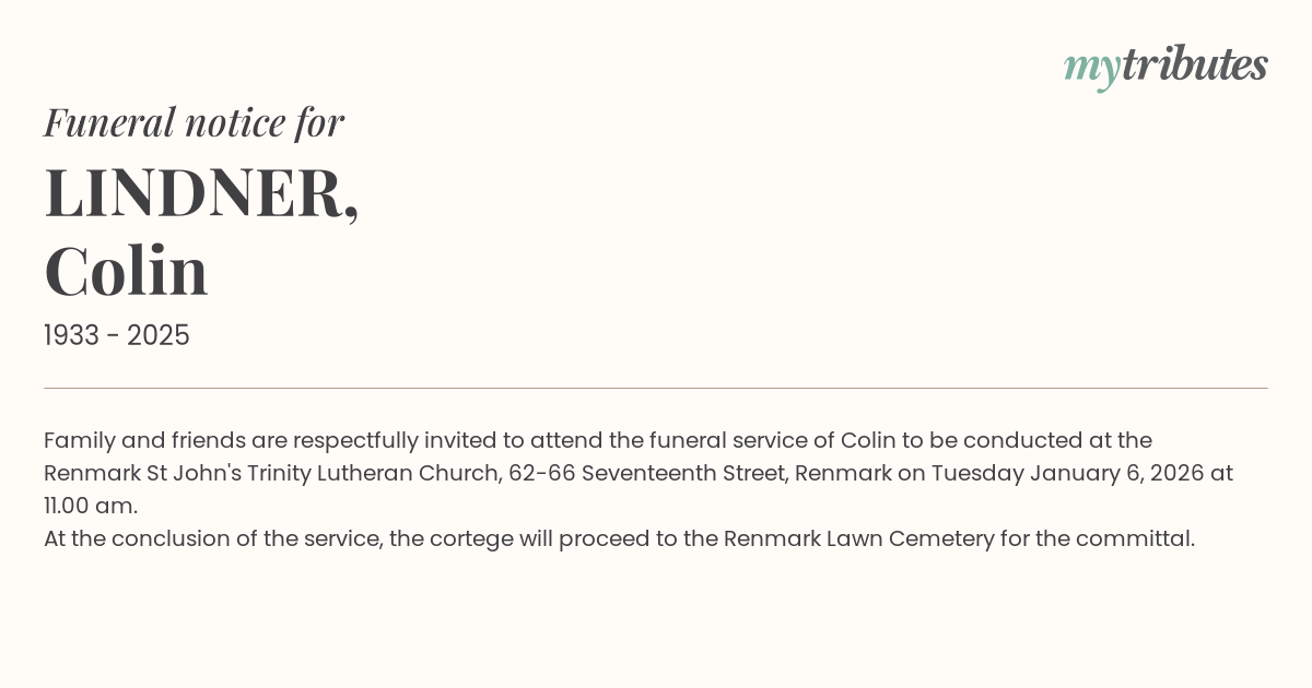 19°CFamily and friends are respectfully invited to attend the funeral service of Colin to be conducted at the Renmark St John's Trinity Lutheran Church, 62-66 Seventeenth Street, Renmark on Tuesday January 6, 2026 at 11.00 am.