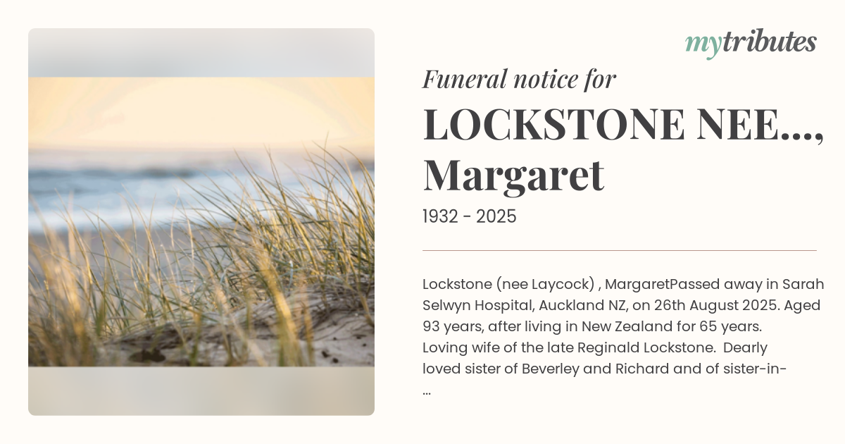 Passed away in Sarah Selwyn Hospital, Auckland NZ, on 26th August 2025. Aged 93 years, after living in New Zealand for 65 years. Loving wife of the late Reginald Lockstone. Dearly loved sister of Beverley and Richard and of sister-in-law Bobbie. Remembered with great affection by her nieces and nephews Anne,Jennifer, David, Ben, Nick and Alistair. A funeral service will be held at the Chapel of Christ the King, 20 Shaftsbury Ave, Auckland, on Monday September 8th at 1.30pm NZ time, followed by a private cremation. a devout and happy lady who is sadly missed by all who knew her. Funeral livestreamed by Davis Funeral Care