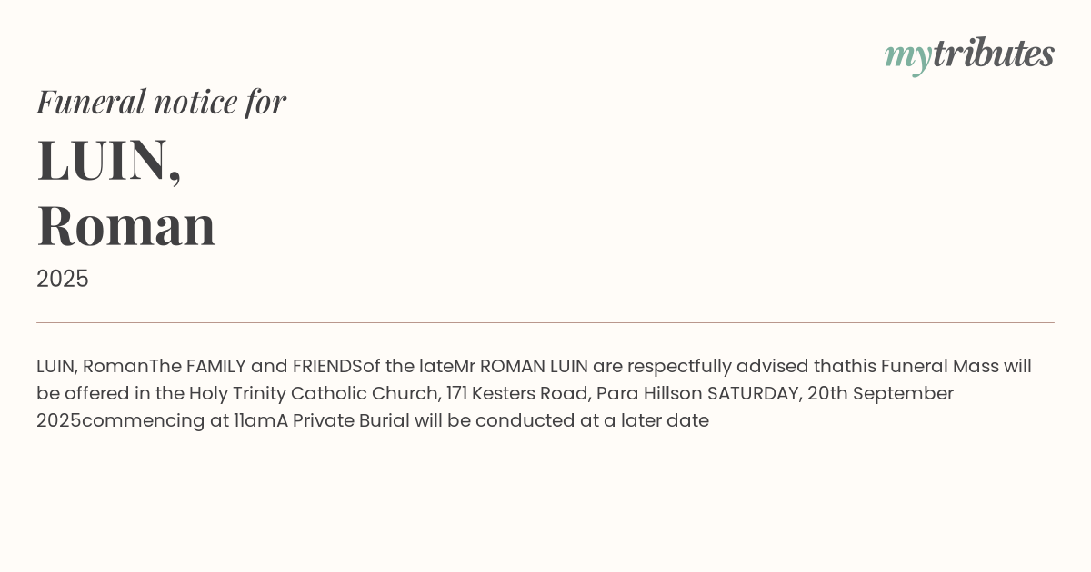 his Funeral Mass will be offered in the Holy Trinity Catholic Church, 171 Kesters Road, Para Hills