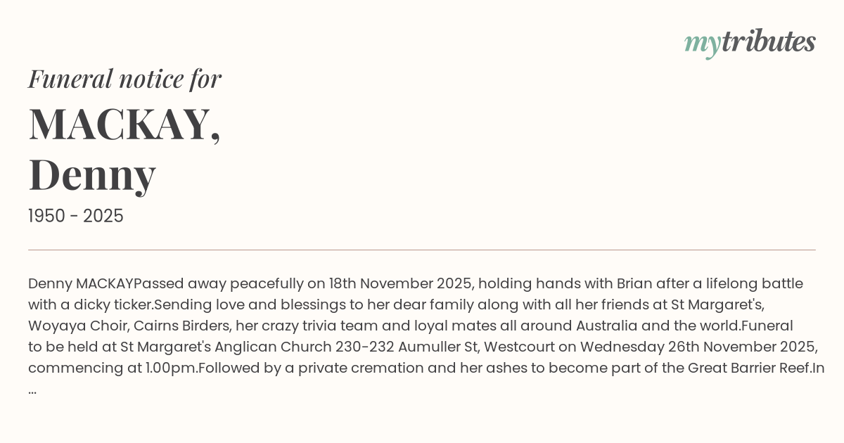 Funeral to be held at St Margaret's Anglican Church 230-232 Aumuller St, Westcourt on Wednesday 26th November 2025, commencing at 1.00pm.