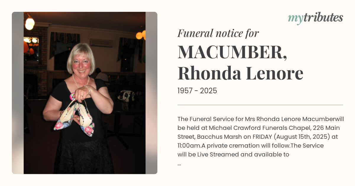 19°CThe Funeral Service for Mrs Rhonda Lenore Macumber