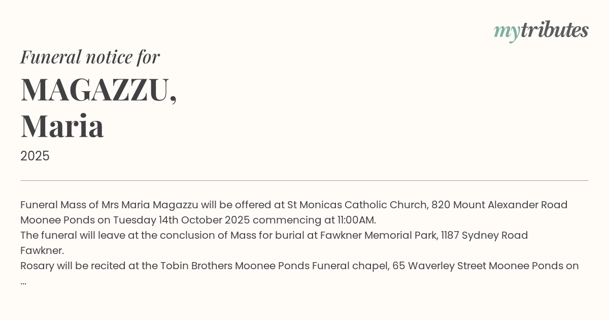 19°CFuneral Mass of Mrs Maria Magazzu will be offered at St Monica’s Catholic Church, 820 Mount Alexander Road Moonee Ponds on Tuesday 14th October 2025 commencing at 11:00AM.