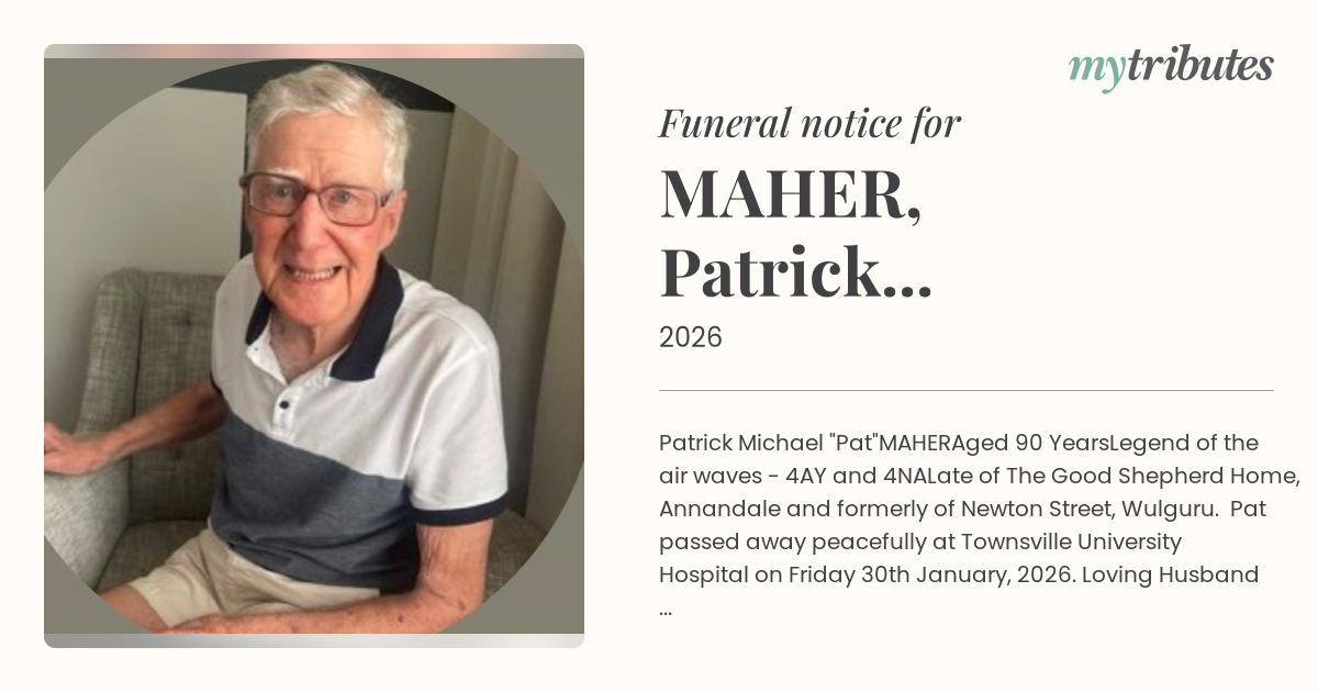 All Relatives and Friends are respectfully invited to attend PAT'S FUNERAL SERVICE which will commence at 10.00 a.m. FRIDAY MORNING 13th FEBRUARY, 2026 at St Joseph The Worker Catholic Church, Stuart Drive, Wulguru. The cortege will proceed to the Belgian Gardens Lawn Cemetery.