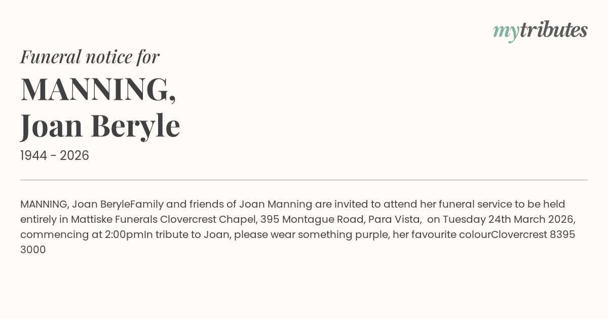 Joan Manning are invited to attend her funeral service to be held entirely in