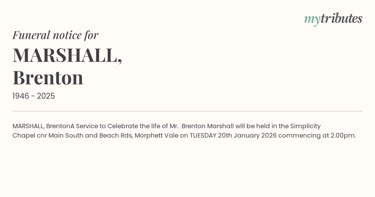 A Service to Celebrate the life of Mr. Brenton Marshall will be held in the Simplicity Chapel cnr Main South and Beach Rds, Morphett Vale on TUESDAY 20th January 2026 commencing at 2.00pm.
