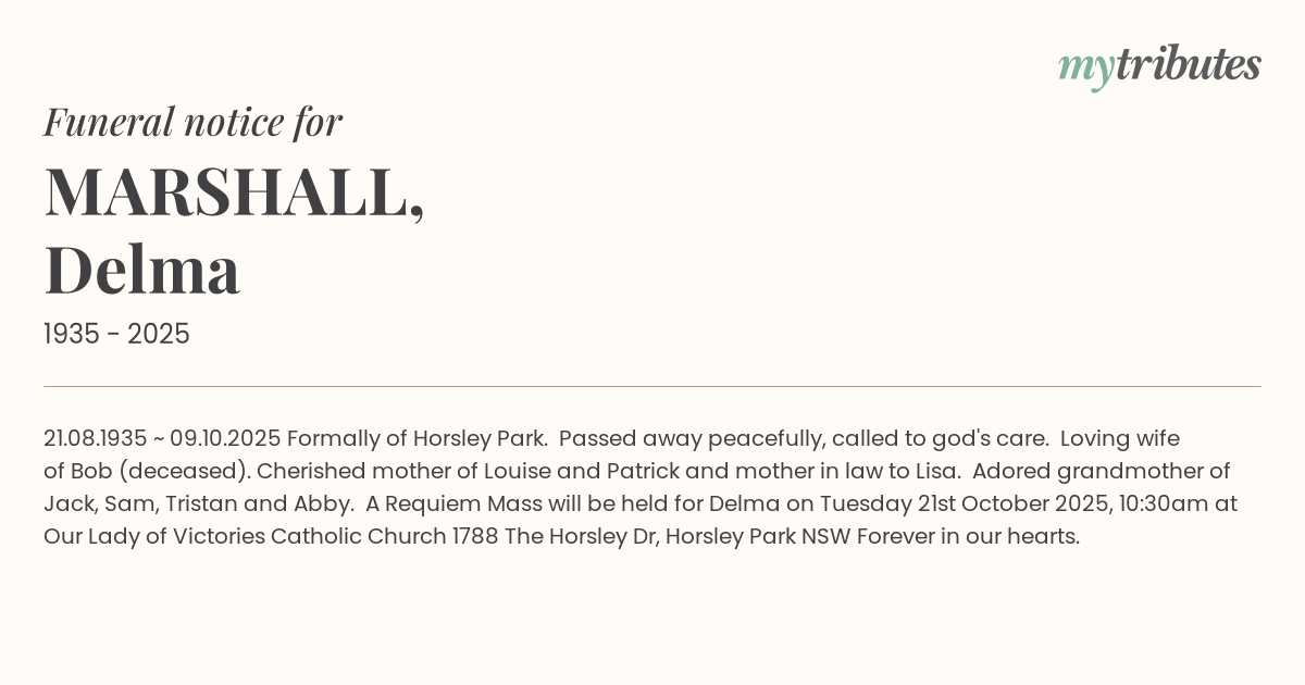 19°C21.08.1935 ~ 09.10.2025 Formally of Horsley Park. Passed away peacefully, called to god's care. Loving wife of Bob (deceased). Cherished mother of Louise and Patrick and mother in law to Lisa. Adored grandmother of Jack, Sam, Tristan and Abby. A Requiem Mass will be held for Delma on Tuesday 21st October 2025, 10:30am at Our Lady of Victories Catholic Church 1788 The Horsley Dr, Horsley Park NSW Forever in our hearts.