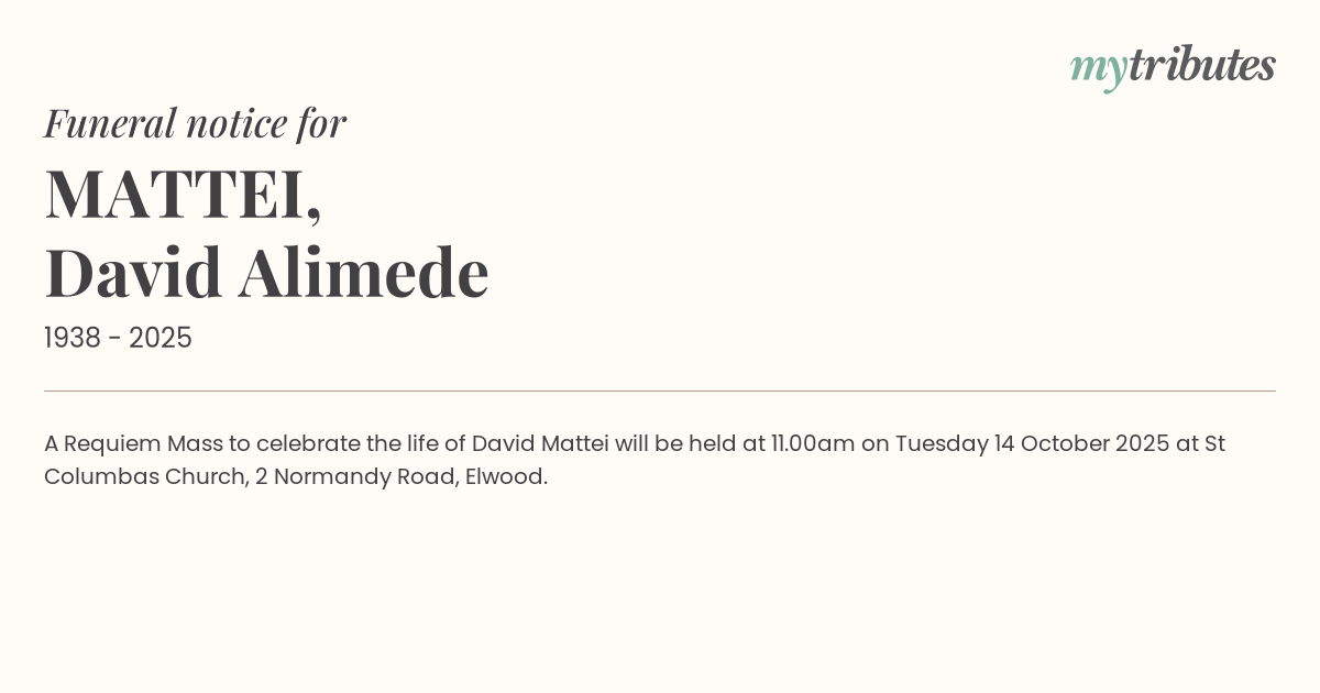 19°CA Requiem Mass to celebrate the life of David Mattei will be held at 11.00am on Tuesday 14 October 2025 at St Columba’s Church, 2 Normandy Road, Elwood.