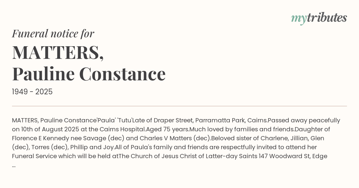 Late of Draper Street, Parramatta Park, Cairns.