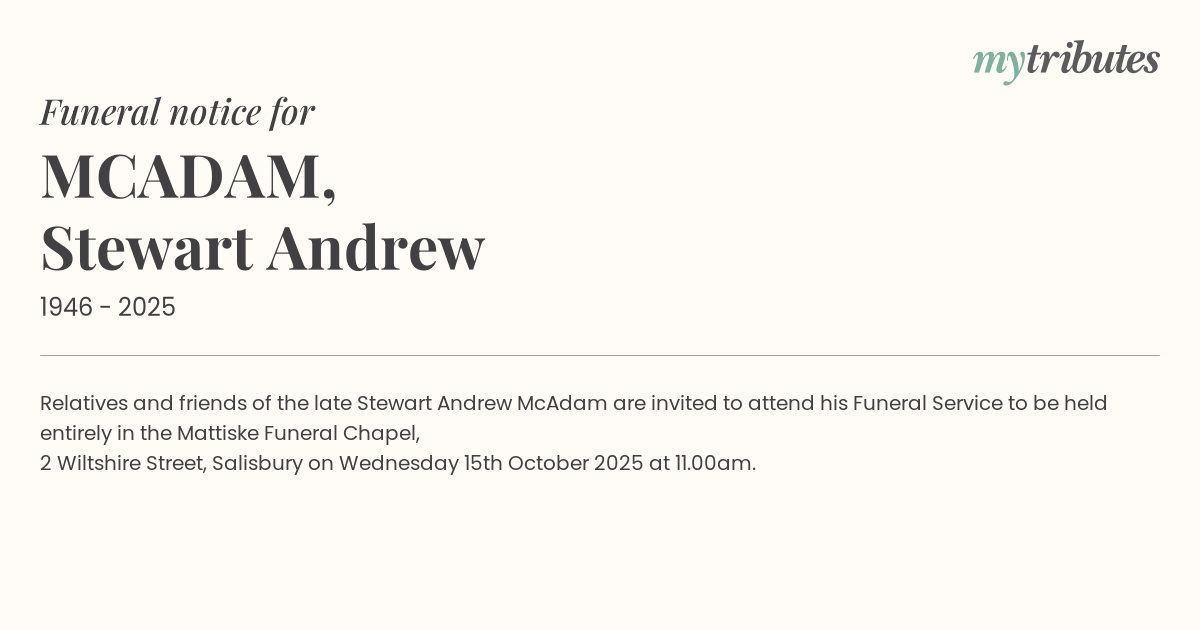 19°CRelatives and friends of the late Stewart Andrew McAdam are invited to attend his Funeral Service to be held entirely in the Mattiske Funeral Chapel,
