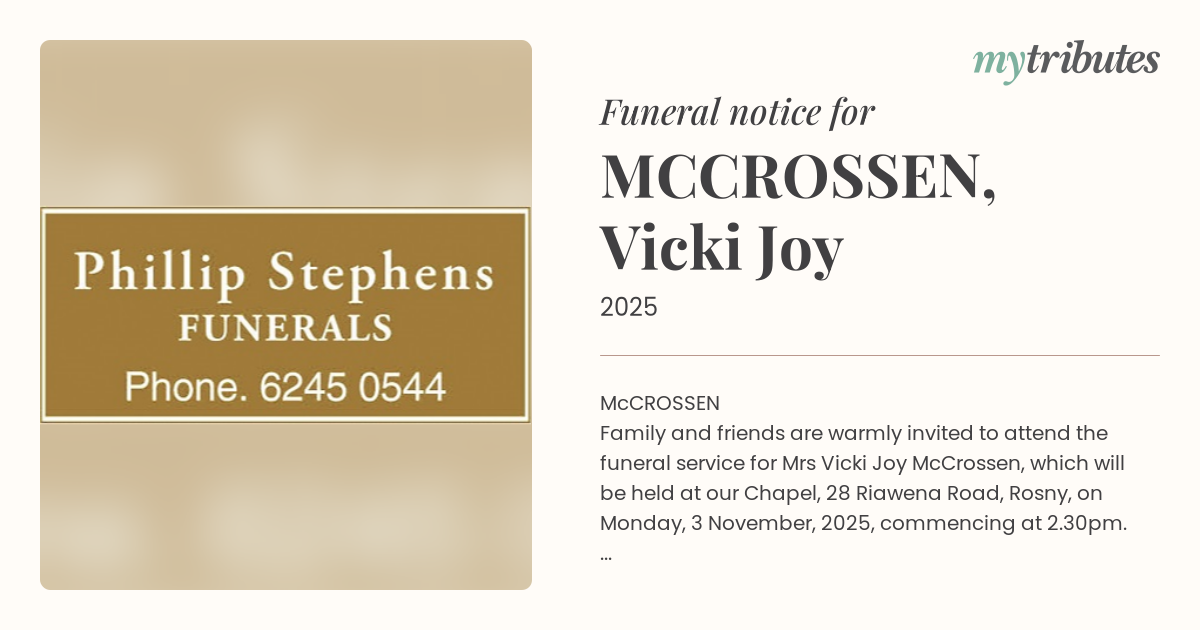 Family and friends are warmly invited to attend the funeral service for Mrs Vicki Joy McCrossen, which will be held at our Chapel, 28 Riawena Road, Rosny, on Monday, 3 November, 2025, commencing at 2.30pm.