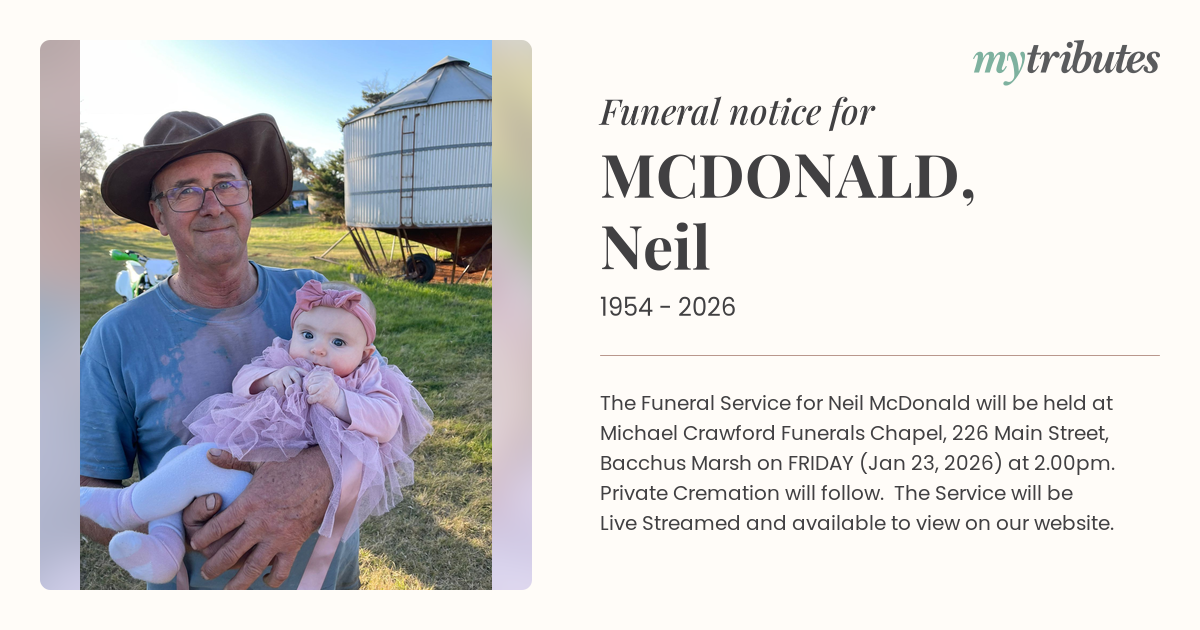 The Funeral Service for Neil McDonald will be held at Michael Crawford Funerals Chapel, 226 Main Street, Bacchus Marsh on FRIDAY (Jan 23, 2026) at 2.00pm. Private Cremation will follow. The Service will be Live Streamed and available to view on our website.