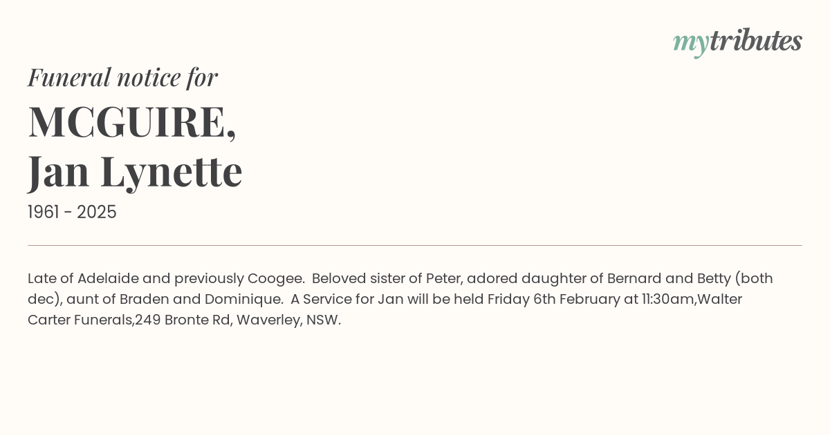 A Service for Jan will be held Friday 6th February at 11:30am,
