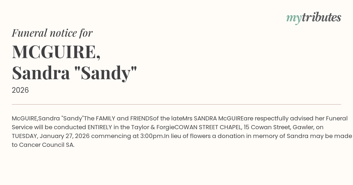 In lieu of flowers a donation in memory of Sandra may be made to Cancer Council SA.