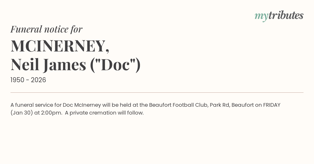 19°CA funeral service for Doc McInerney will be held at the Beaufort Football Club, Park Rd, Beaufort on FRIDAY (Jan 30) at 2:00pm. A private cremation will follow.