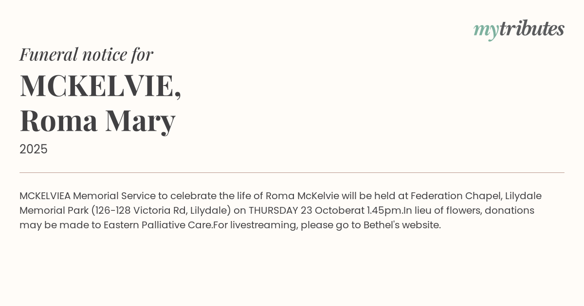 A Memorial Service to celebrate the life of Roma McKelvie will be held at Federation Chapel, Lilydale Memorial Park (126-128 Victoria Rd, Lilydale) on THURSDAY 23 October