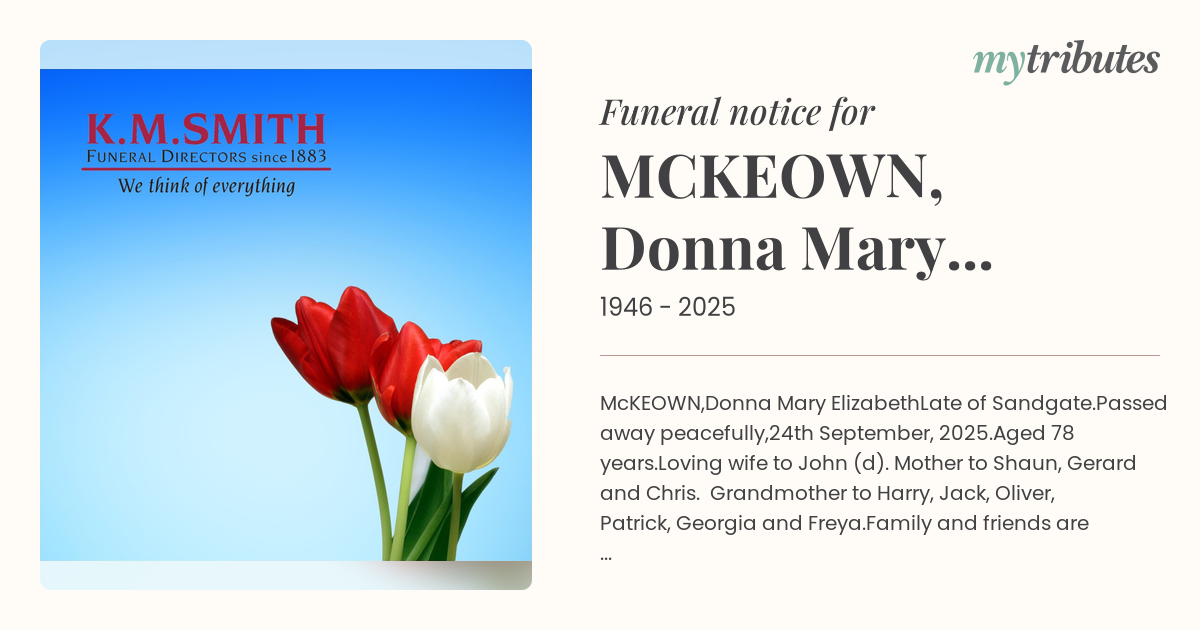 Family and friends are invited to attend a Funeral Mass, for Donna, to be held at Sacred Heart Catholic Church, 118 Brighton Rd, Sandgate, on Friday, 3rd October 2025, commencing at 9:00am.