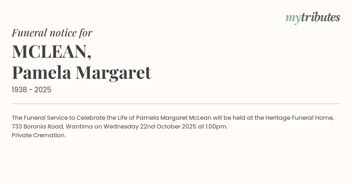 19°CThe Funeral Service to Celebrate the Life of Pamela Margaret McLean will be held at the Heritage Funeral Home, 733 Boronia Road, Wantirna on Wednesday 22nd October 2025 at 1.00pm.