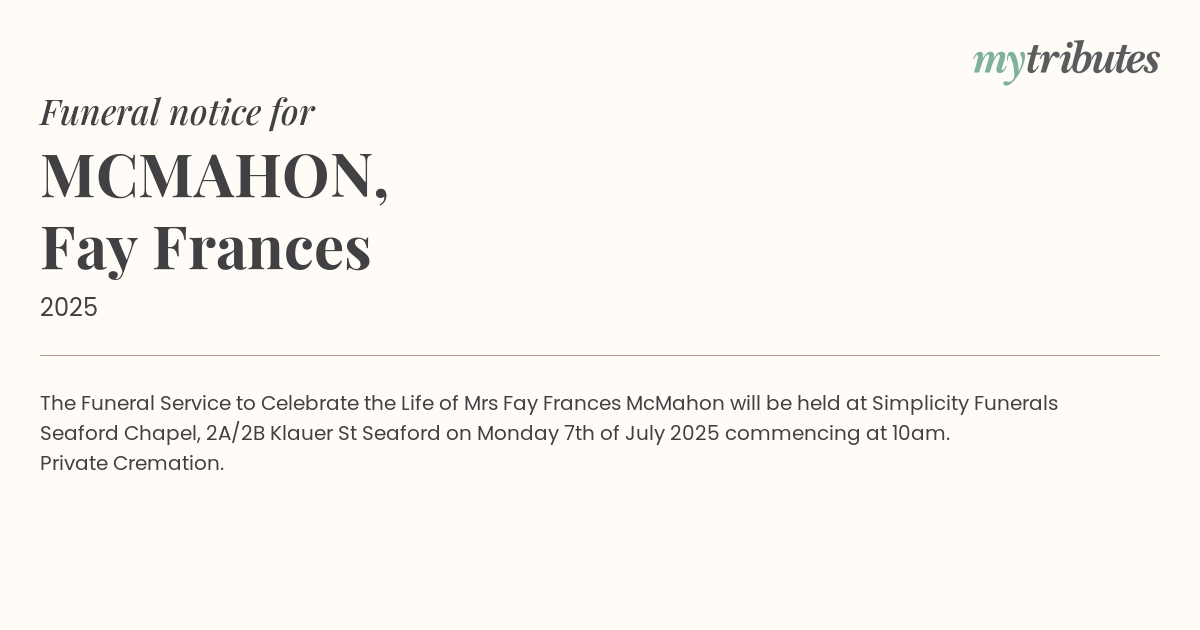 19°CThe Funeral Service to Celebrate the Life of Mrs Fay Frances McMahon will be held at Simplicity Funerals Seaford Chapel, 2A/2B Klauer St Seaford on Monday 7th of July 2025 commencing at 10am.