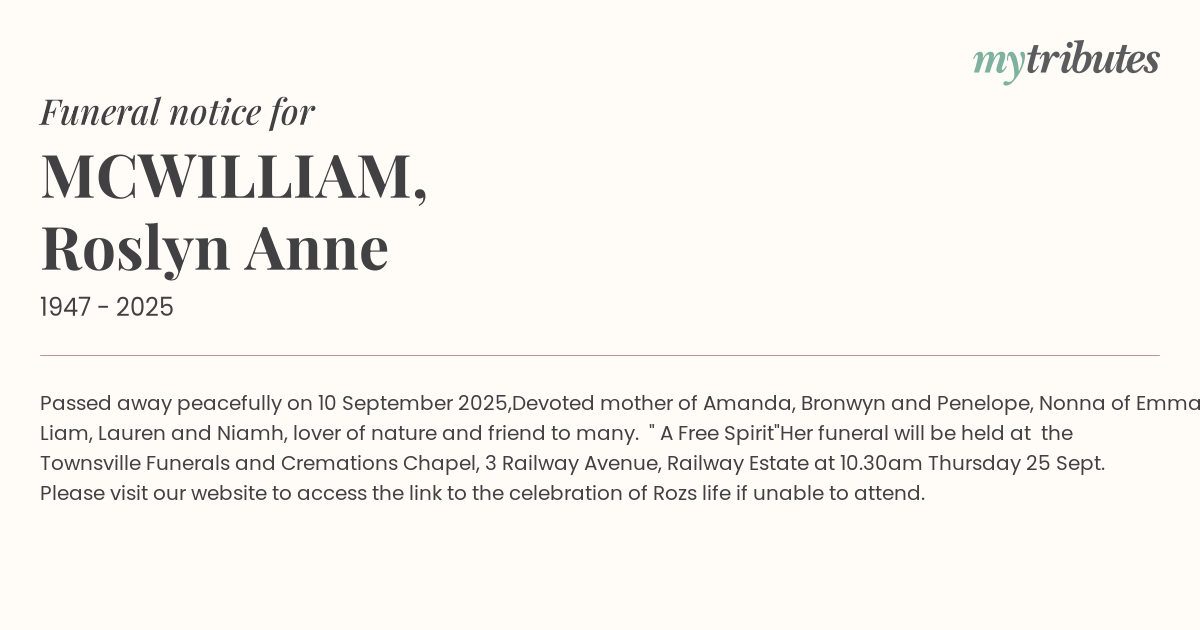 Her funeral will be held at the Townsville Funerals and Cremations Chapel, 3 Railway Avenue, Railway Estate at 10.30am Thursday 25 Sept.